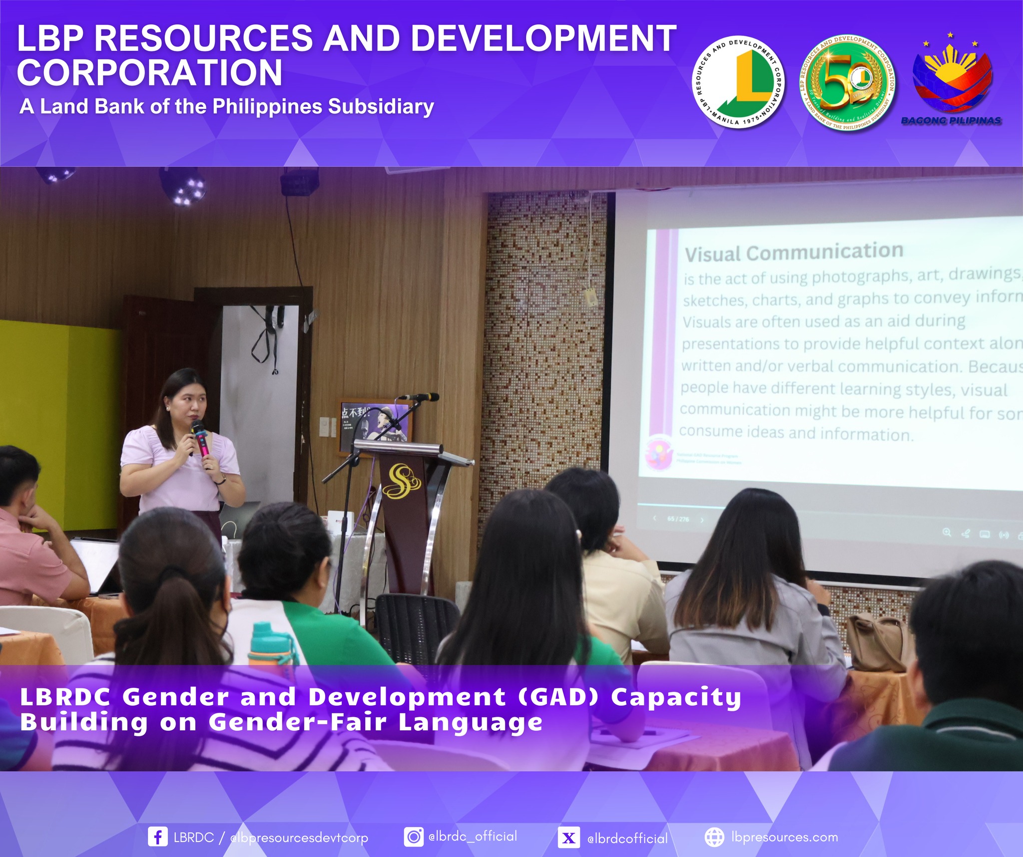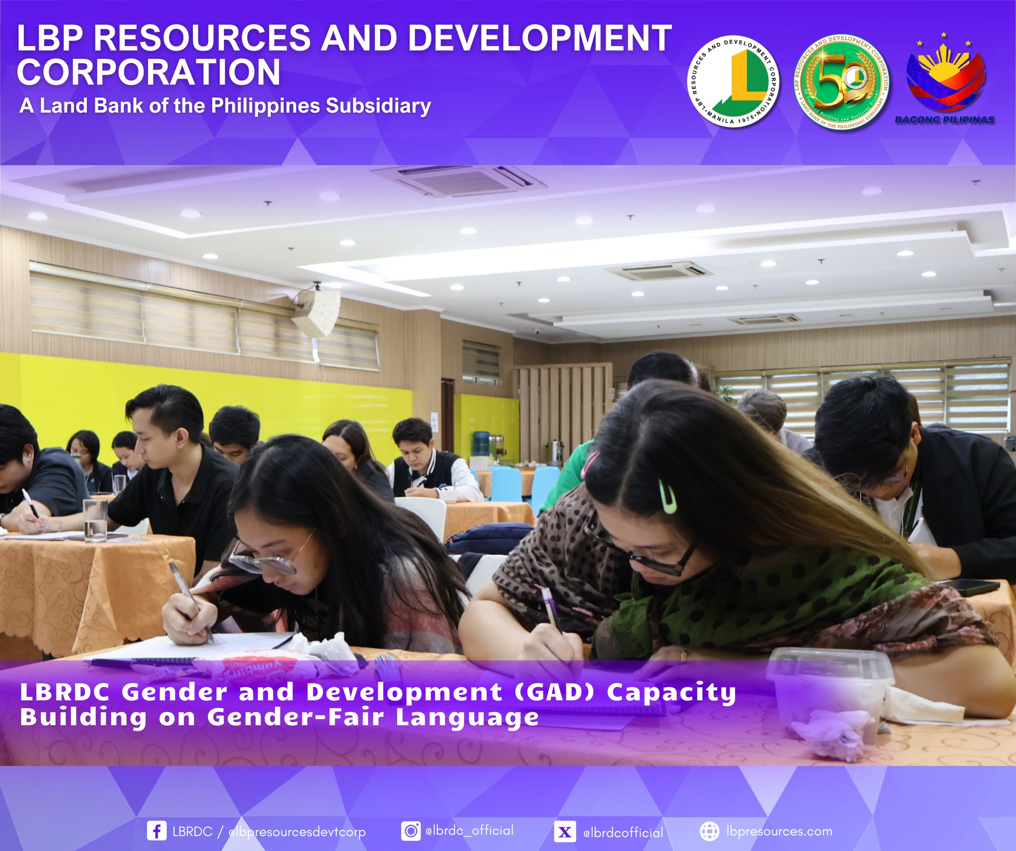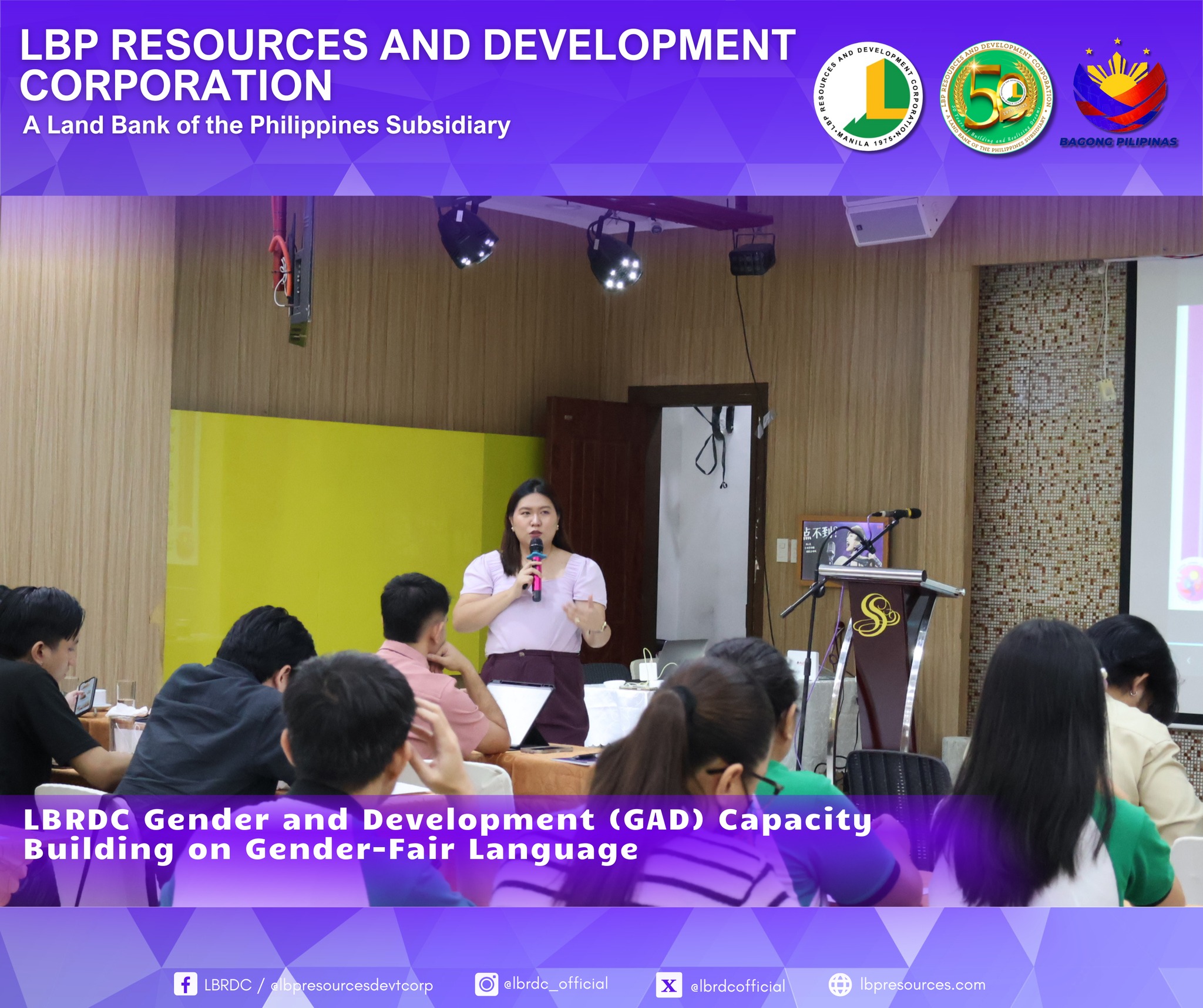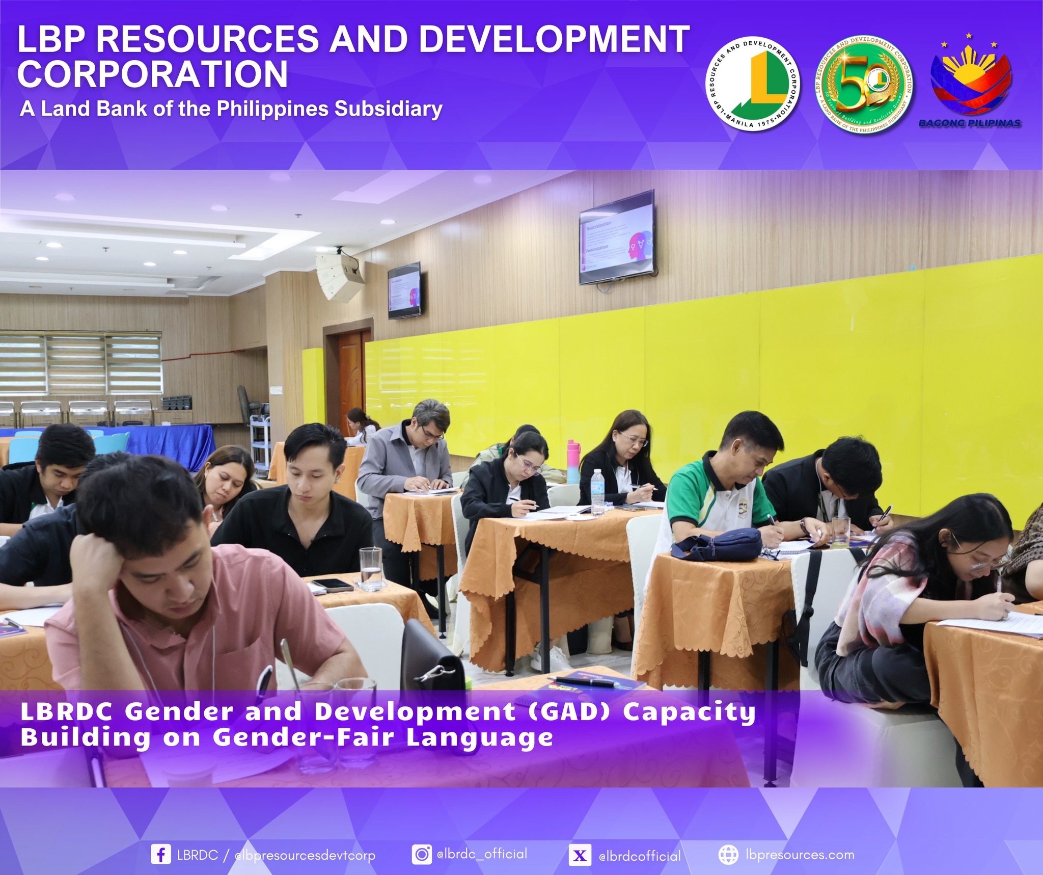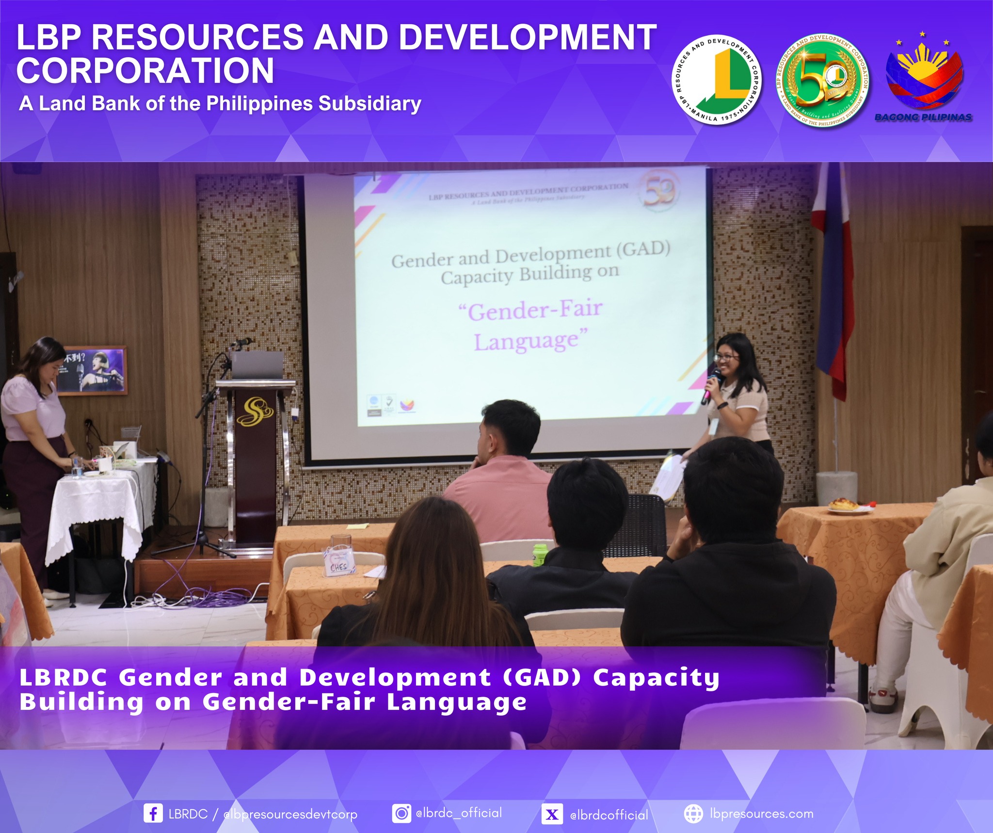 As part of LBRDC’s GAD Plans and Budget for CY 2025, the GAD Technical Working Group successfully organized the Gender-Fair Language and Inclusive Communication Training. The activity highlighted the importance of eliminating gender bias in communication and strengthening employees’ awareness and commitment to gender equality.